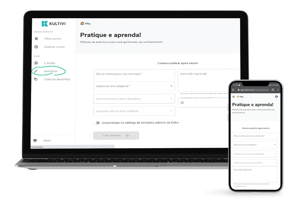 Lá você poderá selecionar simulados prontos, feitos pela equipe Kultivi, com base nos assuntos mais cobrados de cada área.