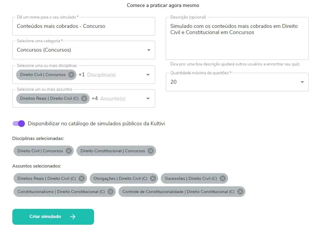 Essa descrição é interessante para compartilhar com outros alunos. Isso porque, ao criar o seu simulado, você poderá autorizar que ele fique no catálogo de simulados prontos.