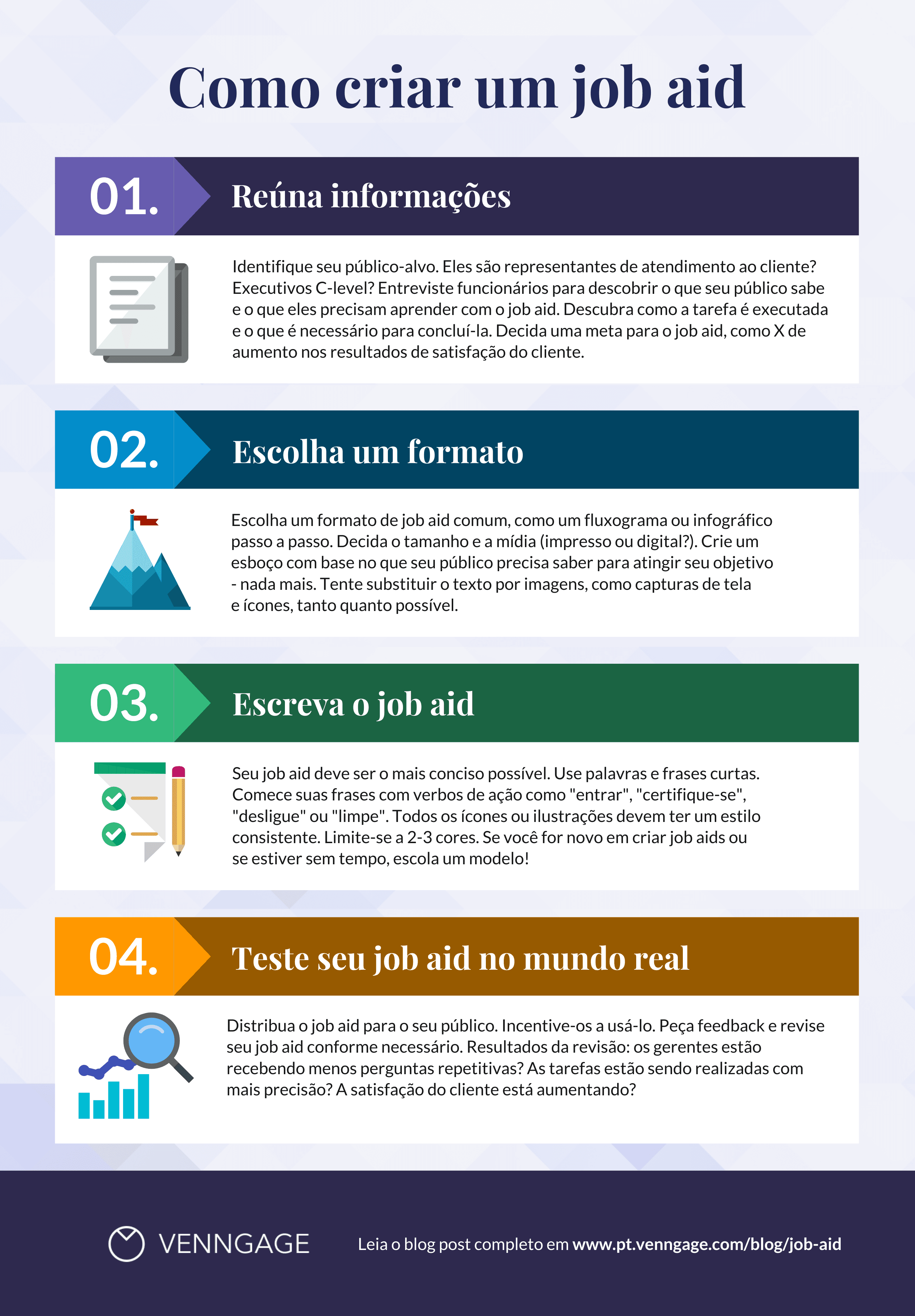 Os estudantes também precisam memorizar processos, etapas, fórmulas, equações e para ajudar nessa tarefa, visualizar o conteúdo na forma de infográficos também pode ajudar bastante. Veja um modelo de infográfico criado para descrever as etapas envolvidas na criação de um job aid e como ocorre a execução adequada cada uma delas: