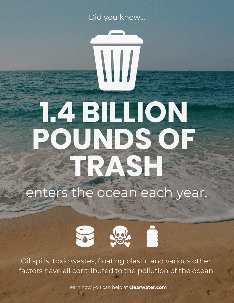 Os pôsteres também podem motivar os alunos a agir em algo. Eles podem informá-los sobre questões importantes que os afetam. Outro exemplo de pôster se concentra na questão do lixo produzido pelo homem em nossos oceanos, levando os leitores a aprender mais e se envolver: